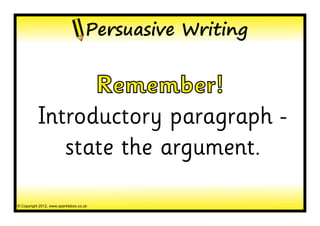 The document provides a checklist for persuasive writing with 3 key points: 1) The introductory paragraph should state the argument. 2) The body should provide evidence to support the viewpoint using facts and reasons both for and against. 3) Questions can be asked to get the reader thinking.