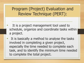 This document discusses Project Evaluation and Review Technique (PERT), Gantt charts, and Management by Objectives (MBO). PERT is a project management tool used to schedule tasks, analyze time needed to complete tasks, and identify the minimum time to complete a project. Gantt charts are graphical representations of project schedules that show tasks, resources, and timelines. MBO is a comprehensive management system that integrates key activities to effectively achieve organizational objectives through goal-setting and periodic performance reviews.