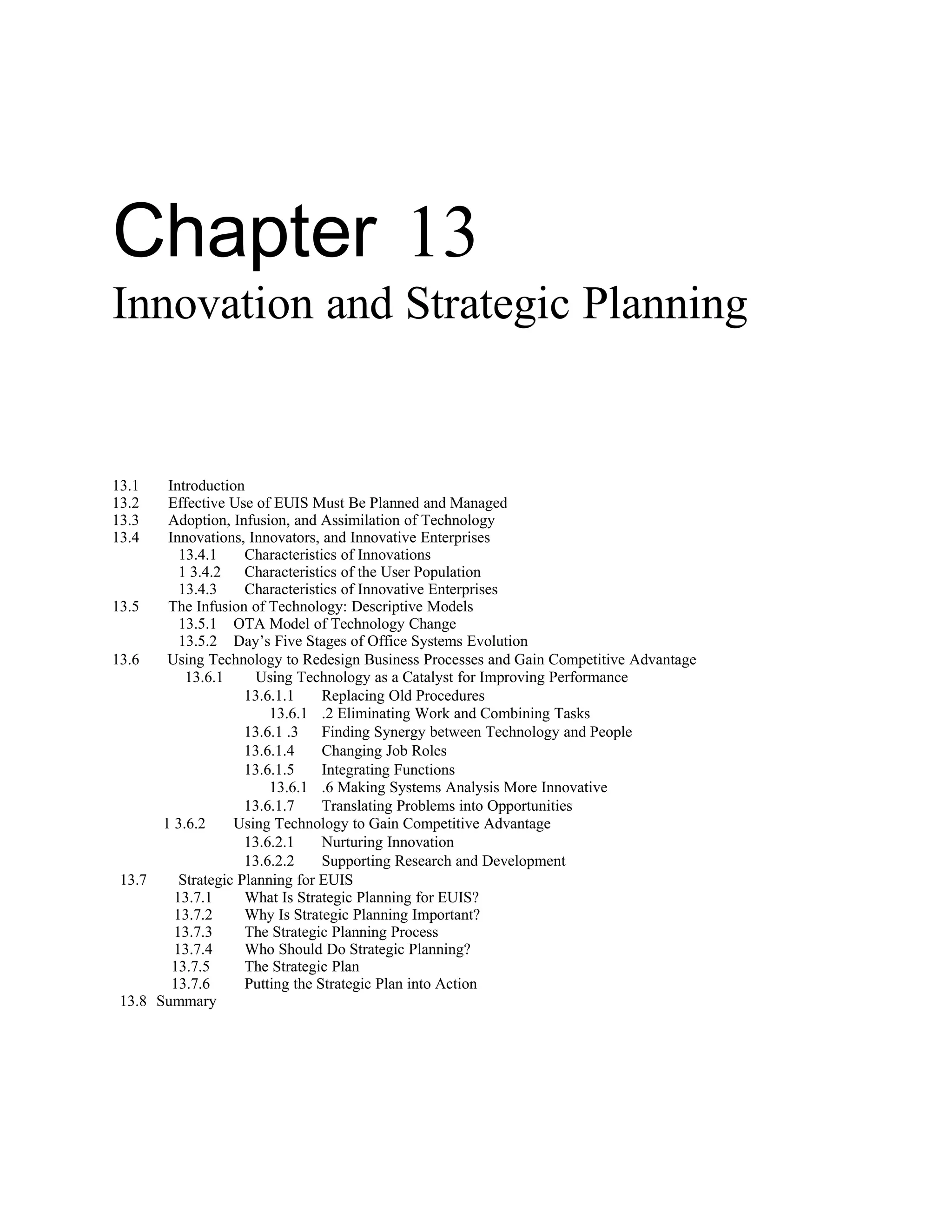 This chapter discusses strategic planning for end-user information systems (EUIS) and innovation. It emphasizes that effective use of EUIS must be carefully planned and managed. Two models that describe how technological innovations are adopted by organizations are presented. The chapter also discusses how technology can be used to restructure business processes and gain competitive advantage. Finally, it provides guidelines for developing an EUIS strategic plan and explains why strategic planning is important for achieving widespread benefits from new technologies.