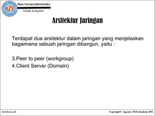 Dokumen ini menjelaskan arsitektur jaringan client-server dan peer-to-peer, termasuk peran server dan klien dalam permintaan layanan. Terdapat penjelasan tentang server DHCP, nama server, dan metode penamaan host, serta protokol yang digunakan untuk transfer file dan komunikasi web. Contoh aplikasi seperti FTP dan HTTP server juga diuraikan, disertai dengan pemaparan mengenai domain dan DNS.