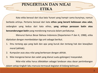 Dokumen tersebut membahas tentang pengertian etika profesi. Etika profesi merupakan bidang etika khusus yang menerapkan prinsip-prinsip moral dasar dalam kehidupan profesional seseorang. Seorang profesional dituntut memiliki pengetahuan, keahlian, tanggung jawab sosial, pengendalian diri, serta etika yang sesuai dengan profesinya."