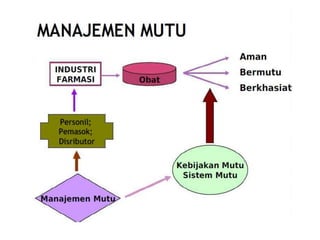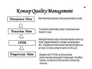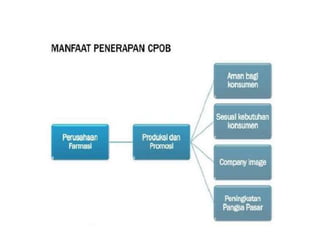 CPob adalah pedoman Cara Pembuatan Obat yang Baik di Indonesia, bertujuan untuk memastikan bahwa obat diproduksi sesuai dengan standar mutu dan aman untuk konsumsi. Dokumen ini mengatur berbagai aspek produksi dan pengawasan mutu untuk meningkatkan kualitas industri farmasi Indonesia agar lebih kompetitif secara internasional. Selain itu, penerapan CPob membantu menghindari kesalahan dalam produksi yang dapat membahayakan konsumen.