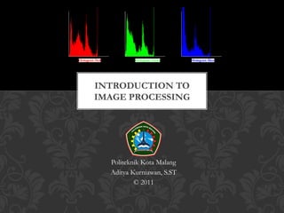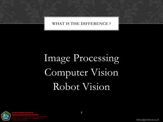The document provides an introduction to image processing, computer vision, and robot vision. It defines image processing as the process of transforming, encoding, and transmitting an image. Computer vision uses computational tools to understand images and derive human-like descriptions. Robot vision allows machines to see their environment and make automated decisions and actions. The document outlines common applications of image processing in medical, technology, communications, gaming, and photography fields. It also describes the digital image acquisition process.