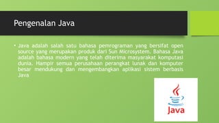 Dokumen ini memberikan pengenalan mendalam tentang bahasa pemrograman Java, termasuk sejarah, berbagai versi seperti JDK, Java SE, Java EE, dan Java ME, serta cara instalasinya. Java adalah bahasa yang bersifat open source dan multiformat yang mendukung berbagai sistem operasi. Selain itu, dokumen ini juga menyertakan latihan untuk menerapkan pengetahuan tentang Java dalam membuat program sederhana.