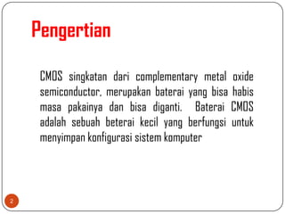 Dokumen ini menjelaskan berbagai jenis baterai CMOS, port pada komputer, dan fungsinya, serta standar dan kegunaan dari berbagai port. Juga dibahas perbandingan antara koneksi analog dan digital seperti VGA dan DVI, serta fungsi dari port serial dan paralel. Selain itu, informasi lengkap tentang protokol dan port yang digunakan untuk berbagai aplikasi jaringan juga disediakan.