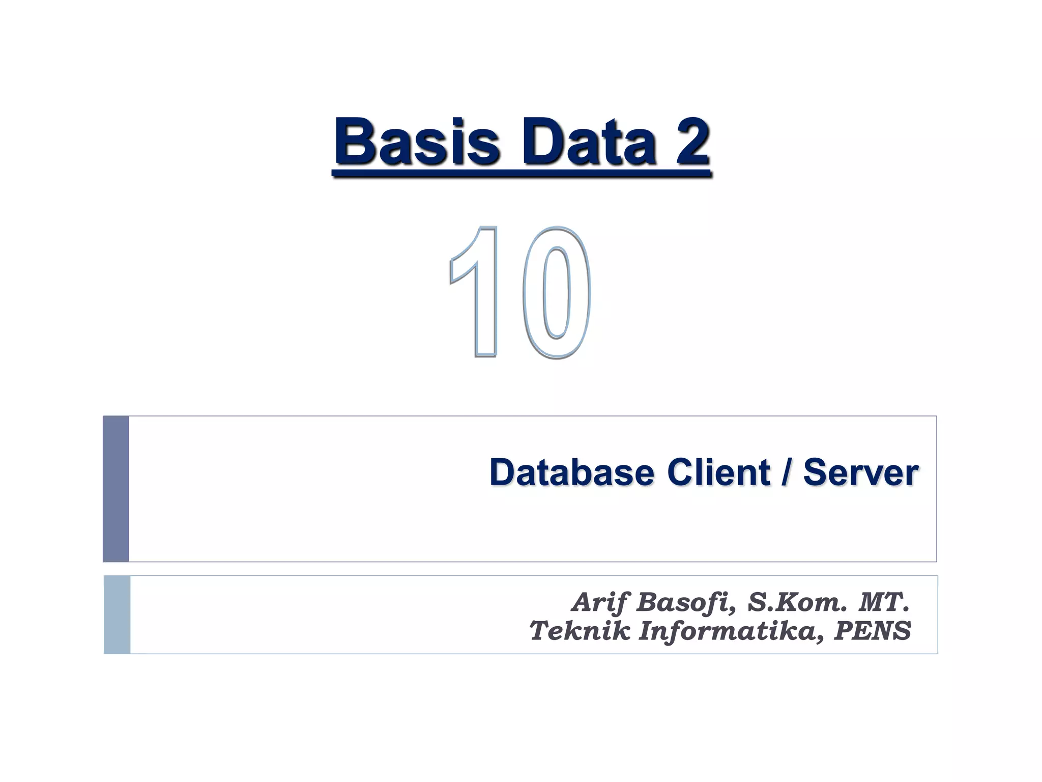 Dokumen ini membahas arsitektur client/server dalam konteks sistem database, menguraikan berbagai model seperti two-tier dan three-tier. Arsitektur ini memisahkan pemrosesan antara client dan server untuk efisiensi, dengan client yang berfungsi sebagai antarmuka pengguna dan server yang menangani logika bisnis serta manajemen data. Terdapat juga penjelasan tentang keuntungan dan tantangan dari model arsitektur yang berbeda, termasuk efeknya pada pengembangan perangkat lunak dan pengelolaan basis data.