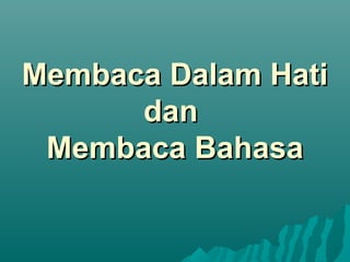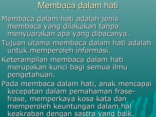 Membaca dalam hati adalah keterampilan penting untuk memperoleh informasi, terdiri dari membaca ekstensif dan intensif. Membaca ekstensif mencakup berbagai metode seperti survei, sekilas, dan dangkal, sementara membaca intensif lebih mendalam dan terperinci. Keterampilan ini mendukung pemahaman yang lebih baik terhadap teks dan melibatkan pengembangan kosa kata serta teknik membaca yang efektif.