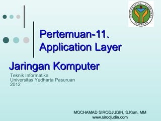 Dokumen tersebut merangkum tentang Application Layer pada jaringan komputer. Secara singkat, dokumen tersebut membahas tentang komunikasi antara client dan server, protokol HTTP yang digunakan untuk mengakses World Wide Web, serta metode-metode seperti cookies dan caching yang digunakan pada Application Layer."