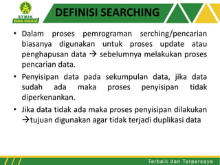 Dokumen tersebut membahas beberapa teknik pencarian data pada array, yaitu sequential search, binary search, dan binary search untuk mencari nilai maksimum dan minimum. Metode-metode tersebut dijelaskan beserta contoh penerapannya untuk mencari suatu nilai dalam array.