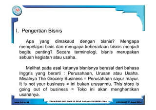 Dokumen tersebut membahas tentang pengertian bisnis dan unsur-unsurnya, termasuk tujuan, stakeholder, persaingan usaha, jenis perusahaan, dan fungsi dasar bisnis. Bisnis didefinisikan sebagai kegiatan atau usaha yang bertujuan untuk memenuhi kebutuhan masyarakat dan memperoleh keuntungan dengan melibatkan pemilik, karyawan, pemasok, kreditur, dan pelanggan.
