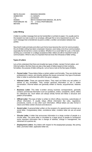 The document discusses a lesson on letter writing in an English language class. It defines what a letter is and explains that while electronic communication is now common, letters are still used for formal communication like job applications and official notices.