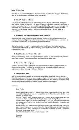 Finally, it provides tips for writing letters, such as identifying the letter type, using proper greetings and closings, getting straight to the point, using polite language, and keeping formal letters concise. It includes an example letter and questions about the letter.