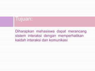 Program Studi Pendidikan Teknik Informasi dan Komputer membahas interaksi antara manusia dan komputer, dengan fokus pada desain sistem interaksi yang mempertimbangkan prinsip-prinsip komunikasi. Materi mencakup saluran masukan dan keluaran manusia, bagaimana manusia memproses informasi, serta perangkat dan teknik untuk memfasilitasi interaksi antara manusia dan komputer.