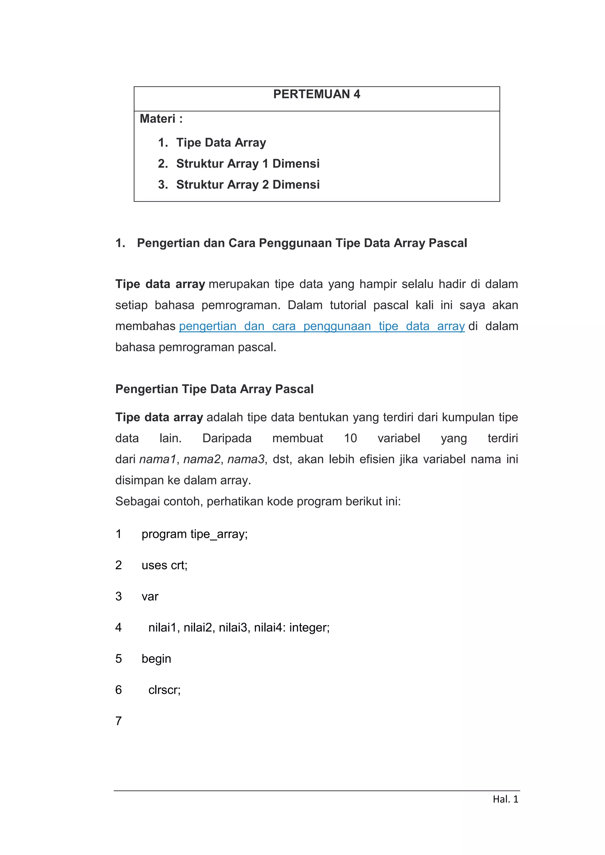Dokumen ini membahas tentang tipe data array dalam bahasa pemrograman Pascal. Terdiri dari pengertian tipe data array, cara penggunaannya untuk array satu dimensi dan dua dimensi beserta contoh kode programnya. Tipe data array digunakan untuk menyimpan kumpulan data yang sama tipe dalam satu variabel secara efisien. Array dapat diakses menggunakan indeks dan dapat berisi satu atau dua dimensi tergantung kebutuhan
