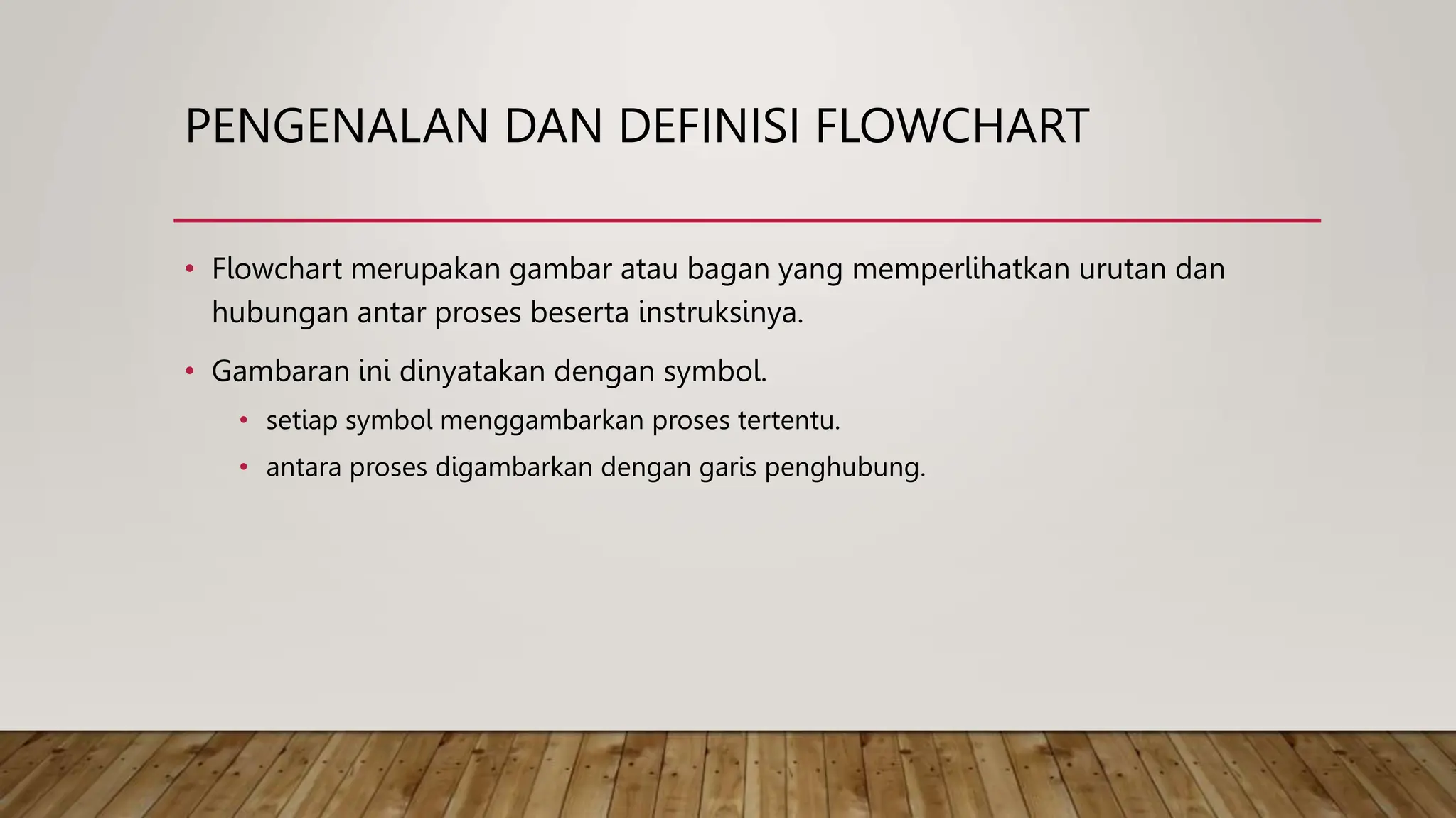 Dokumen ini membahas tentang pengenalan flowchart, termasuk definisi, jenis-jenis, dan kaidah kaidah umum dalam pembuatannya. Flowchart digunakan untuk menggambarkan urutan dan hubungan antar proses dengan simbol-simbol tertentu. Juga dijelaskan berbagai elemen flowchart, seperti input, proses, output, dan percabangan, serta contoh penggunaan dalam konteks pembuatan program.