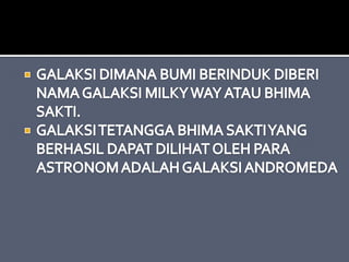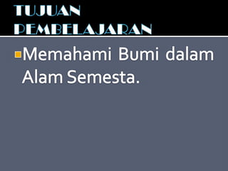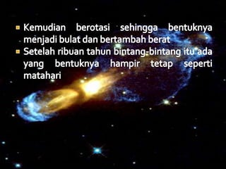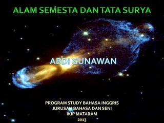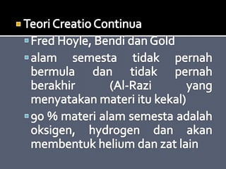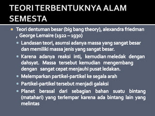 Dokumen tersebut membahas tentang teori-teori tentang alam semesta dan pembentukan sistem tata surya, di antaranya adalah teori nebula yang menjelaskan tentang pembentukan sistem tata surya dari awan gas dan debu antarbintang, teori bintang kembar yang menyatakan bahwa Matahari dan Bumi terbentuk dari bintang kembar, teori pasang surut yang menjelaskan pengaruh pasang surut pada pembentukan planet, serta