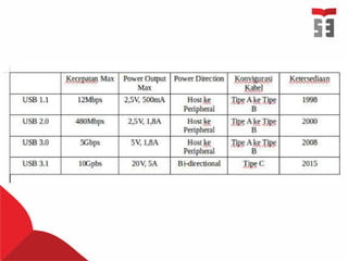 Dokumen ini menjelaskan tentang berbagai jenis memori komputer, termasuk memori internal seperti RAM dan ROM, serta memori eksternal seperti hard disk dan flash disk. Setiap jenis memori memiliki karakteristik, fungsi, dan cara kerja yang berbeda, termasuk kecepatan akses dan penyimpanan data. Selain itu, dokumen ini juga membahas perkembangan teknologi USB dan berbagai tipe konektor yang digunakan.