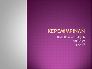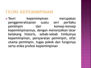 Dokumen ini membahas teori kepemimpinan yang mencakup perilaku pemimpin, sejarahnya, serta etika profesi kepemimpinan. Pemimpin perlu memiliki jiwa kepemimpinan sejak dini agar dapat memenuhi tugasnya dalam mengarahkan dan mempengaruhi kelompok. Konsep kepemimpinan penting dalam setiap organisasi untuk mencapai tujuan yang diharapkan.