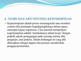 Kepemimpinan adalah proses memengaruhi untuk mencapai tujuan organisasi, yang dipelajari melalui praktik dan pengalaman. Terdapat berbagai tipologi kepemimpinan, seperti otokratis, militeristis, paternalistis, karismatik, dan demokratis, yang memiliki karakteristik serta cara pengaruh yang berbeda. Faktor-faktor seperti pandangan, nilai, dan pengalaman pemimpin mempengaruhi efektivitas kepemimpinan dalam organisasi.