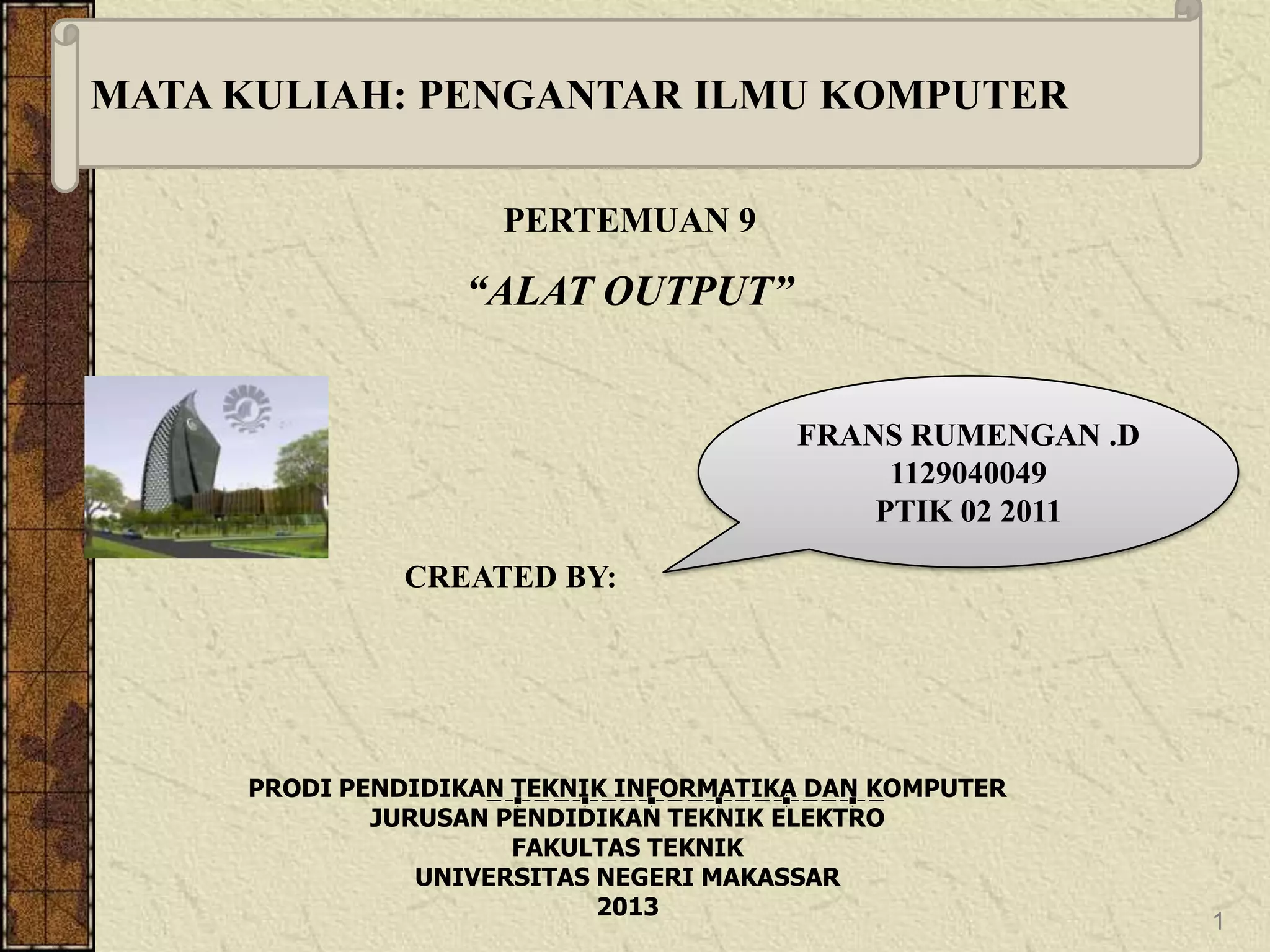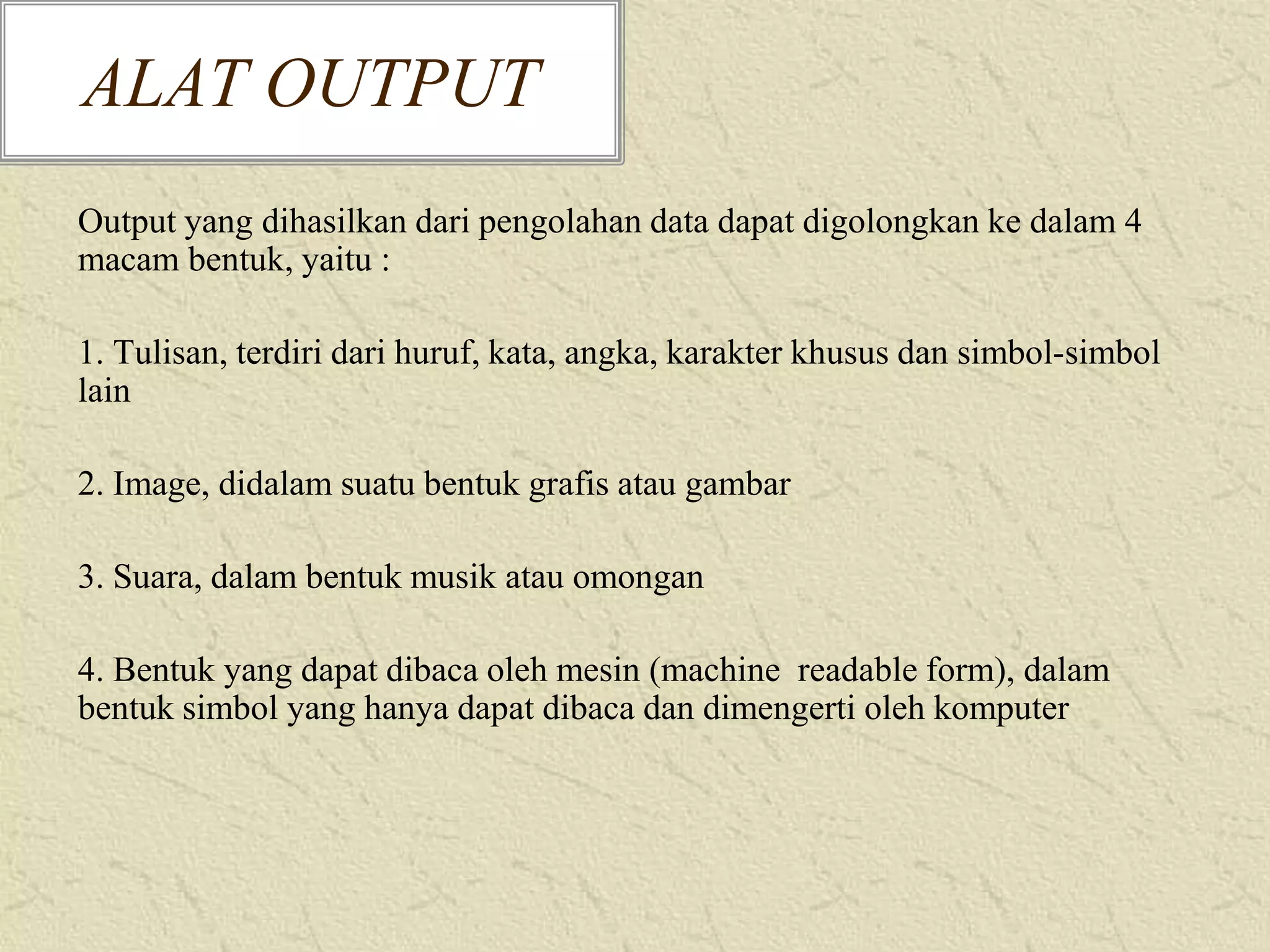Dokumen ini membahas tiga jenis alat output yaitu hard copy device untuk mencetak tulisan dan gambar pada kertas, soft copy device untuk menampilkan tulisan dan gambar secara elektronik, serta drive device untuk merekam data dalam bentuk yang dapat dibaca mesin seperti disk dan tape. Beberapa contoh alat output yang dijelaskan adalah printer, plotter, video display, speaker, disk drive, dan tape drive.