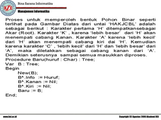 Dalam Algoritma dibawahini Cabang Kiri dan Cabang Kanan ditentukan dengan cara : Simpul yang berisi informasi yang nilainya “ Lebih Besar” dari simpul yang berikut akan ditempatkan sebagai cabang Kanan, jika “Lebih Kecil” akan ditempatkan sebagai Cabang Kiri.