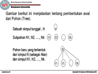 Dokumen tersebut membahas tentang struktur pohon (tree) termasuk istilah-istilah dasar, sifat utama pohon berakar, contoh pohon berakar, cara menggambarkan pohon, pohon biner, dan latihan soal.