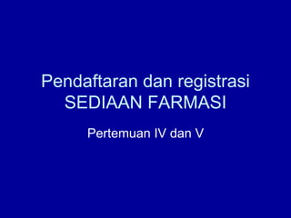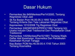 Dokumen tersebut membahas tentang persyaratan pendaftaran dan registrasi produk farmasi seperti obat jadi, obat tradisional, dan kosmetika. Termasuk di dalamnya adalah peraturan yang mengatur bidang tersebut, proses permohonan izin usaha, persyaratan sarana produksi, dan sanksi yang diberikan apabila tidak memenuhi persyaratan.