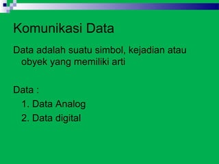 Dokumen ini membahas tentang komunikasi data dan perbandingan antara data analog dan digital. Data adalah simbol, kejadian, atau objek yang memiliki arti. Data digital bersifat diskrit sedangkan data analog bersifat kontinyu. Kualitas komunikasi data meliputi performansi, konsistensi, reliabilitas, recovery, dan keamanan.