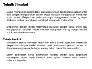 Teknik simulasi merupakan proses memodelkan sistem nyata dan melakukan eksperimen dengan model tersebut untuk memahami perilaku sistem. Ada beberapa langkah studi simulasi seperti formulasi masalah, validasi model, eksekusi program, dan analisis hasil. Contoh aplikasi simulasi adalah GPSS dan SIMAN.
