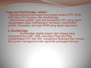 Dokumen ini menjelaskan peran dan fungsi dari berbagai komponen pada motherboard dan prosesor, termasuk chipset northbridge dan southbridge, berbagai jenis bus, chip super I/O, dan slot ekspansi. Juga diuraikan fungsi dan bagian-bagian dari prosesor, seperti register, ALU, dan unit kontrol. Selain itu, dokumen ini mencakup jenis-jenis port dan proses dasar yang dilakukan oleh CPU untuk menjalankan instruksi.