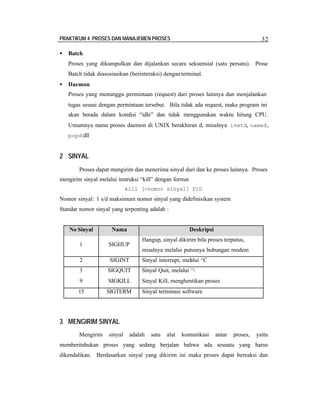 Dokumen ini membahas tentang proses dan manajemen proses dalam sistem operasi Linux, termasuk konsep dasar seperti jenis proses (foreground, batch, daemon), pengiriman sinyal antar proses, dan kontrol proses melalui shell. Mahasiswa diharapkan dapat memahami dan menerapkan teknik manajemen proses seperti penjadwalan prioritas dan penggunaan perintah seperti ps, top, fg, bg, dan kill. Praktikum yang diberikan juga mencakup berbagai percobaan praktis untuk mengontrol dan memantau proses yang berjalan di Linux.