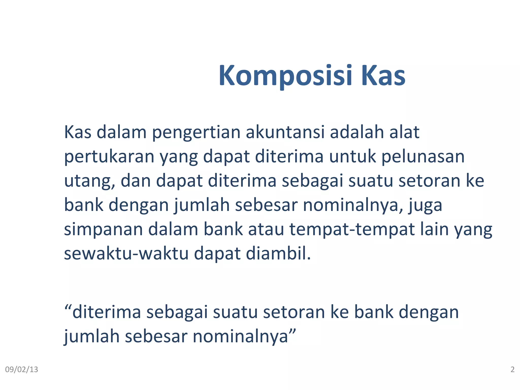 Dokumen ini membahas pentingnya pengawasan dan pencatatan kas dalam akuntansi, termasuk berbagai metode untuk mengelola dana kas kecil seperti metode imprest dan fluktuasi. Penerapan prosedur yang ketat dalam pengeluaran dan penerimaan kas serta melakukan rekonsiliasi bank juga ditekankan untuk menjaga keakuratan dan keamanan dana. Contoh kasus dan jurnal akuntansi disertakan untuk memperjelas penerapan sistem dana kas kecil.