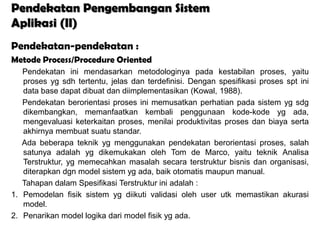 Teks tersebut membahas beberapa pendekatan pengembangan sistem aplikasi, yaitu pendekatan berorientasi proses, pendekatan berorientasi objek, dan pendekatan SADT. Pendekatan berorientasi proses berfokus pada proses sistem, pendekatan berorientasi objek berfokus pada data, sedangkan pendekatan SADT menggunakan diagram aktivitas dan data.