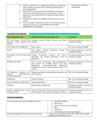 Koti Vasu has over 10 years of experience in performance testing and engineering. He has extensive hands-on experience using tools like LoadRunner, ALM, JMeter, and SoapUI to test a wide variety of applications. Some of his responsibilities include test planning, script development, test execution, analyzing results, and improving performance. He has worked on projects for clients such as Farmers Insurance Group, Zurich, Cisco, and others.