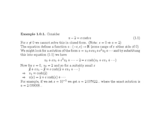 This document provides an overview of perturbation techniques for analyzing heat transfer problems. It discusses several objectives: to demonstrate the usefulness of perturbation techniques; to assist unfamiliar readers in understanding the techniques; and to show how the techniques are applied to specific problems. The document then reviews various perturbation methods - regular perturbation method, method of strained coordinates, method of matched asymptotic expansions, and method of extended perturbation series. It also discusses limitations and advantages of perturbation methods.