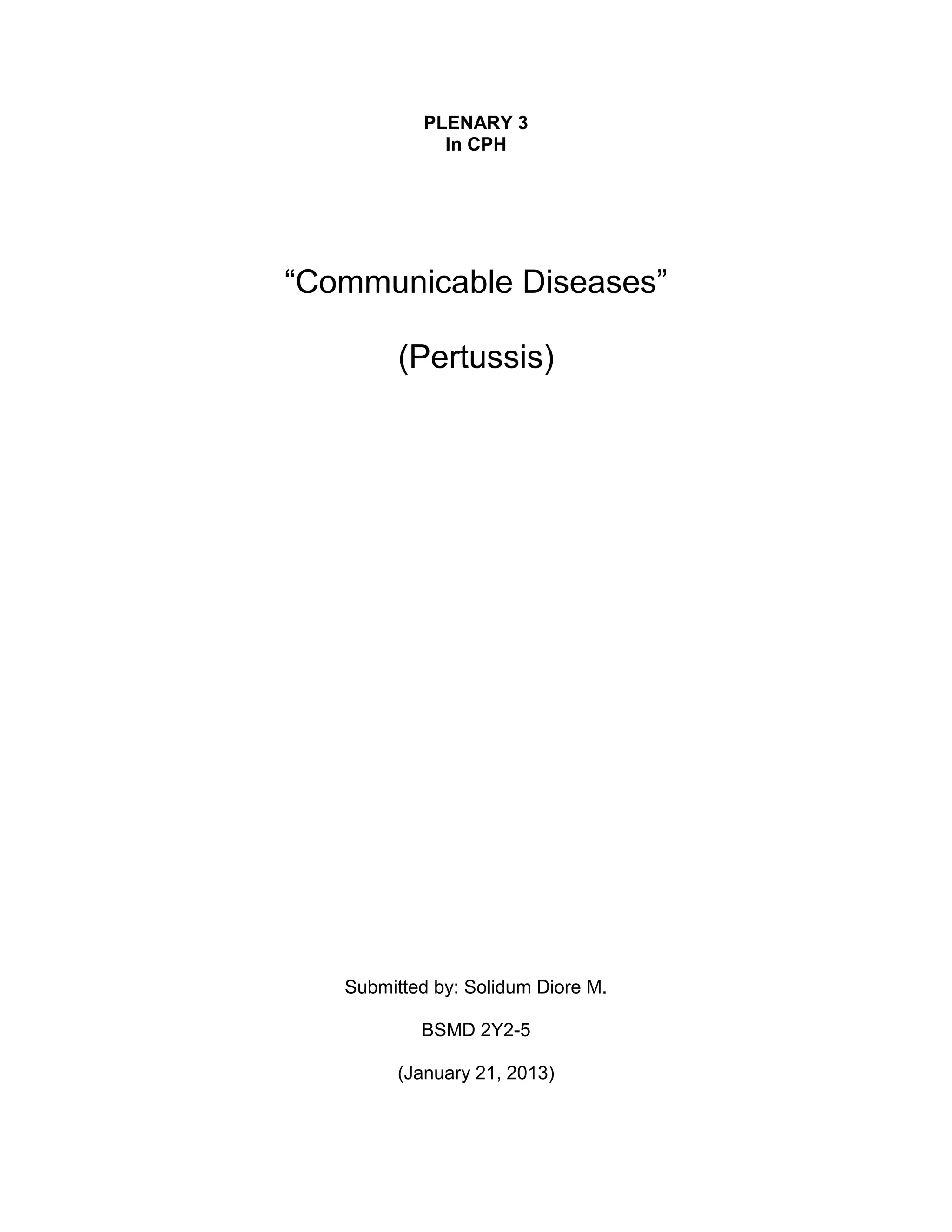 Pertussis, also known as whooping cough, is an acute infection of the respiratory tract caused by the Bordetella pertussis bacterium. It initially presents with mild cold-like symptoms that progress to severe coughing fits ending in a high-pitched whoop as the person inhales. It is most contagious in the early stages when symptoms resemble a common cold. Pertussis is prevented through routine DPT immunization of infants and boosters for children up to age 5. Treatment focuses on reducing symptoms and spread through antibiotics or isolation.