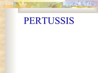 This document discusses pertussis (whooping cough), including its etiology, epidemiology, pathophysiology, clinical features, diagnosis, complications, treatment, and prevention. Pertussis is caused by the bacterium Bordetella pertussis and is highly contagious, especially in children ages 1-5 years old. It presents in stages including catarrhal, paroxysmal, and convalescent stages. Diagnosis is usually clinical based on paroxysmal coughing fits. Complications can include respiratory issues, seizures, and intracranial bleeding. Treatment involves erythromycin or similar antibiotics and supportive care. Prevention is through vaccination and prophylactic antibiotics for close contacts when