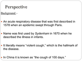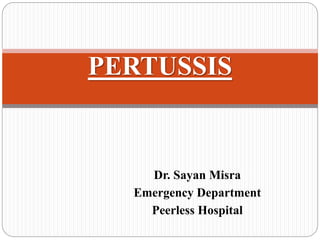 This document provides an overview of pertussis (whooping cough) including its epidemiology, clinical presentation, diagnosis, treatment and post-exposure prophylaxis. Pertussis is caused by Bordetella pertussis and presents in three stages - catarrhal, paroxysmal and convalescent. It is highly contagious and vaccination is the primary prevention. For treatment, supportive care and macrolide antibiotics are recommended to reduce infectivity. Post-exposure prophylaxis with antibiotics may be considered for at-risk contacts.
