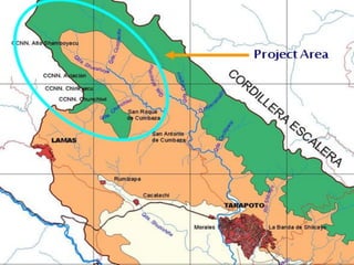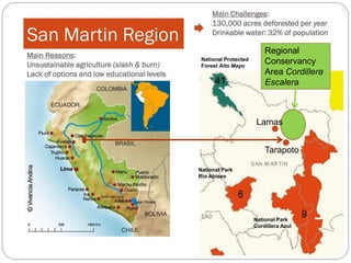 This document outlines a sustainability project in the San Martin Region of Peru. The project aims to promote sustainable agriculture, forest conservation, and rural education through community-based tourism, permaculture techniques, and educational experiences for travelers. Some key challenges in the region include deforestation and lack of access to clean water and education. The project works with local grassroots organizations to develop small businesses in food, handicrafts, and ecotourism to support conservation of protected forest areas and empower rural communities.