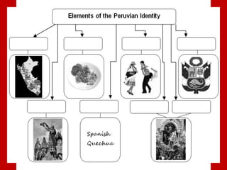 This document provides information about Peru's national identity. It discusses Peru gaining independence from Spain in 1821 and the Inca Empire forming the oldest known complex society. Some key facts presented include Peru's highest peak being Mount Huascarán, its longest river being the Amazon, and a typical Peruvian dish being ceviche. Peru's national day is celebrated in July and its national identity draws from Inca, Spanish, and African cultural influences and traditions.