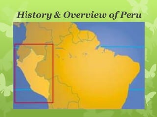 Peru is the third largest country in South America, located on the western coast with a population of over 8 million people who primarily speak Spanish. Nearly half of Peruvians live in poverty. Childcare in Peru began in 1902 with the first kindergarten and has since expanded, with the government now providing both formal centers focused on education as well as informal, community-based centers focused on health and nutrition.