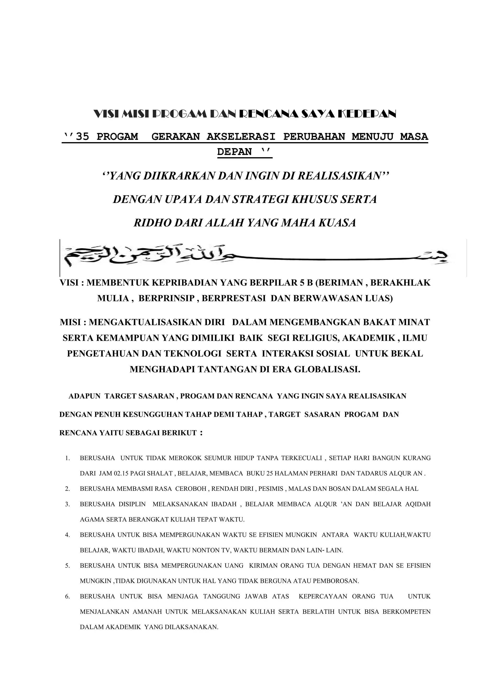 Dokumen tersebut merupakan visi, misi, program dan rencana untuk masa depan yang diinginkan oleh Juli Wantoro. Visinya adalah membentuk kepribadian yang berpilar 5B dan misinya mengaktualisasikan diri dalam mengembangkan bakat, minat, dan kemampuan baik secara religius, akademik, ilmu pengetahuan, dan interaksi sosial. Dokumen ini berisi 35 program dan rencana beserta 8 alasan utama untuk berubah demi menc
