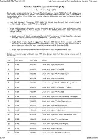Dokumen ini menjelaskan perubahan kode map pada Surat Setoran Pajak (SSP) yang berlaku sejak 5 Januari 2006, di mana kode mata anggaran penerimaan (map) berubah dari 4 angka menjadi 6 angka. Wajib pajak dapat menggunakan formulir SSP lama hingga 31 Desember 2006 dengan ketentuan tertentu, serta mendapatkan penjelasan lengkap mengenai kombinasi kode map baru dan lama untuk jenis pajak yang berbeda. Dokumen ini juga mencakup tabel perbandingan kode map lama dan baru serta jenis pajak yang relevan.