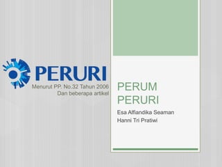 Perum Peruri adalah badan usaha milik negara yang ditugaskan untuk mencetak uang rupiah dan produk sekuriti lainnya, didirikan pada 15 September 1971 melalui penggabungan dua perusahaan. Perum Peruri bertujuan mendukung program pemerintah dalam bidang ekonomi dan pembangunan nasional serta memiliki struktur organisasi yang meliputi menteri, direksi, dan dewan pengawas. Proses pencetakan uang melibatkan perencanaan, pengadaan bahan, pencetakan, distribusi, dan penarikan uang, melibatkan berbagai pihak termasuk Bank Indonesia.