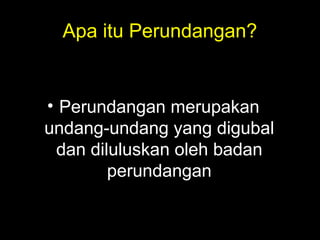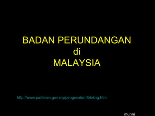 Badan perundangan di Malaysia terbahagi kepada Parlimen dan Dewan Undangan Negeri yang memiliki tanggungjawab utama untuk mengubal dan meluluskan undang-undang. Parlimen juga berfungsi sebagai sebuah forum untuk menyemak dasar kerajaan dan mempunyai kuasa mutlak dalam undang-undang kewangan. Struktur Parlimen terdiri daripada Dewan Rakyat dan Dewan Negara, di mana Dewan Rakyat mempunyai lebih banyak kuasa berbanding Dewan Negara.