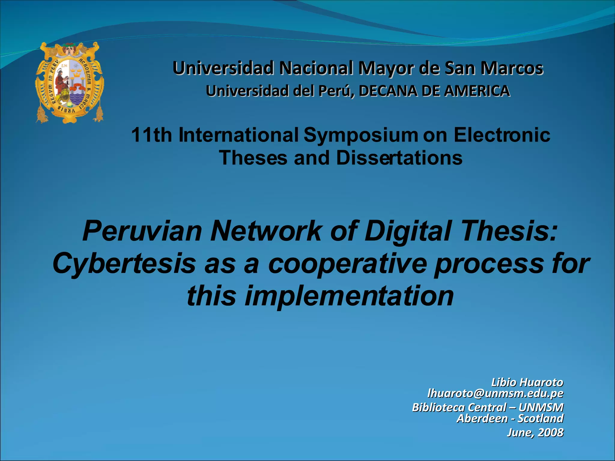 The document discusses the Peruvian Network of Digital Theses (RPTD) and its efforts to promote open access to electronic theses and dissertations in Peru and other Latin American countries. It provides details on the history and growth of RPTD since 1999, its strategic alliances with universities in Peru, Bolivia and other nations, and its participation in initiatives like the Andean Digital Library. Statistics are given showing usage of the RPTD website and digital collections from several universities. Challenges are also noted, like institutions lacking infrastructure and standard procedures for managing electronic theses.