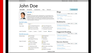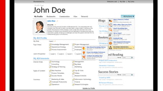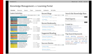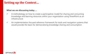The document discusses creating a participative model for knowledge management and learning using SharePoint as an infrastructure, highlighting the current approach, emerging needs, and the vision for pervasive knowledge management. It emphasizes overcoming cultural barriers to adoption and integrating knowledge sharing tools into everyday work practices. The document outlines steps and strategies for organizations to effectively implement and leverage SharePoint for enhanced knowledge collaboration and resource sharing.
