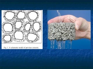 This document provides information about a project on pervious concrete. It discusses the need for pervious concrete to address issues caused by impervious surfaces like parking lots and driveways. It then lists the members of the project and provides details on the objectives, which are to determine how material proportions affect the engineering properties of pervious concrete, including porosity and compressive strength. The document gives background on pervious concrete and discusses its properties in both fresh and hardened states. It also provides a schedule for the project and information on typical material proportions used in pervious concrete.
