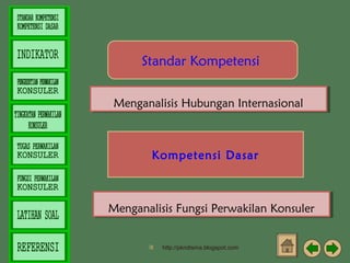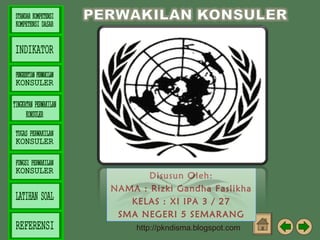 Dokumen tersebut membahas tentang perwakilan konsuler yang meliputi pengertian, tingkatan, tugas, dan fungsinya. Perwakilan konsuler adalah perwakilan negara yang kegiatannya meliputi seluruh kepentingan negara di bidang konsuler. Tingkatannya terdiri dari konsul jenderal, konsul, wakil konsul, dan agen konsul. Tugasnya meliputi bidang ekonomi, kebudayaan, administrasi, dan lain