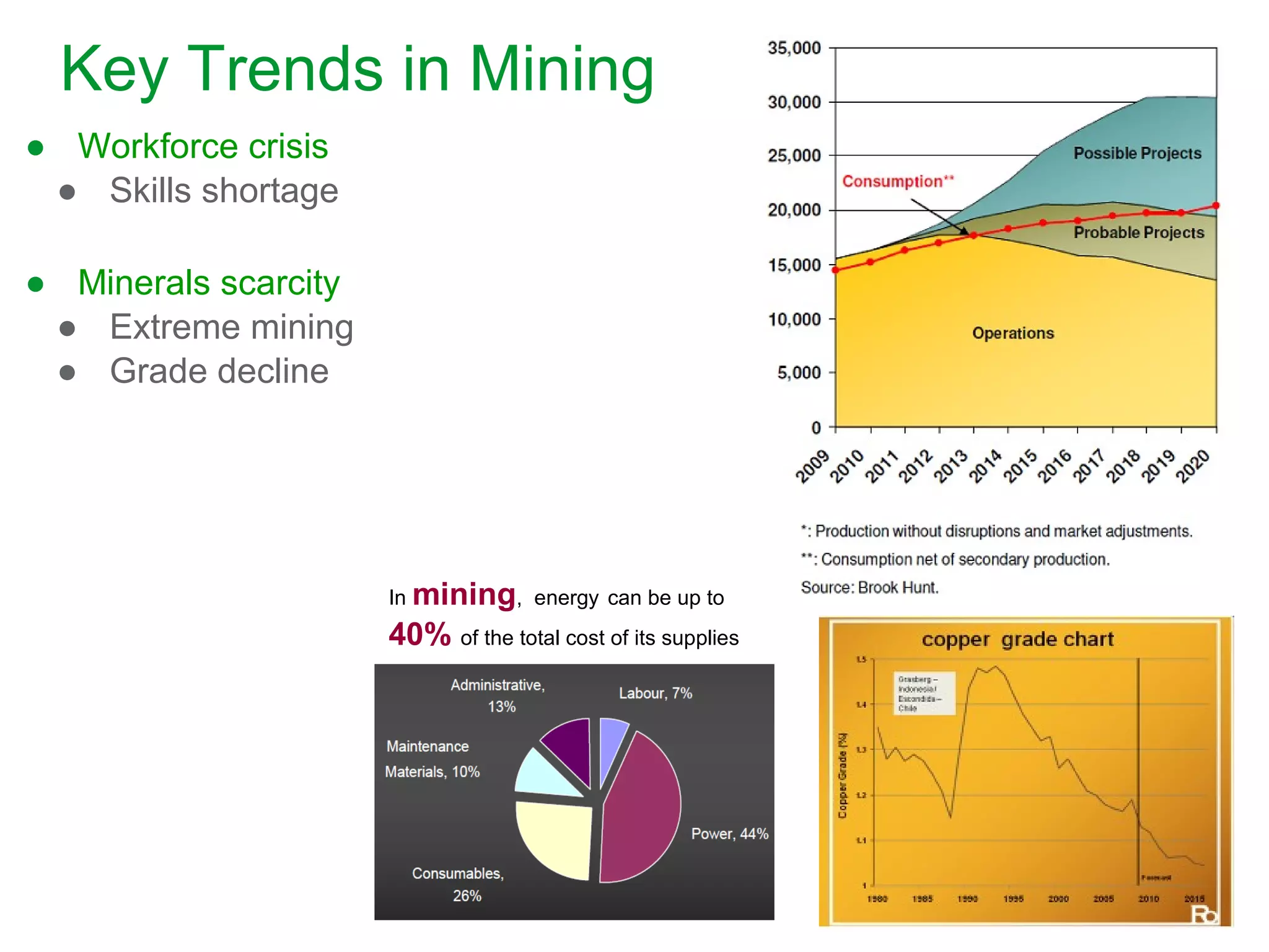 The document discusses innovative process control systems and energy management in the mining industry, highlighting trends such as workforce crisis, skills shortages, and the need for increased efficiency. It emphasizes the importance of integrated systems that facilitate collaboration among stakeholders and streamline operations while reducing costs. Key features include enhanced design capabilities, energy efficiency measures, and user-customizable libraries to optimize performance.
